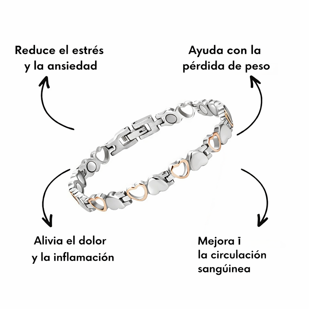 Cuando se lleva puesta la pulsera, los imanes interactúan con el campo magnético natural del cuerpo y generan una fuerza magnética que favorece el bienestar de diversas maneras.